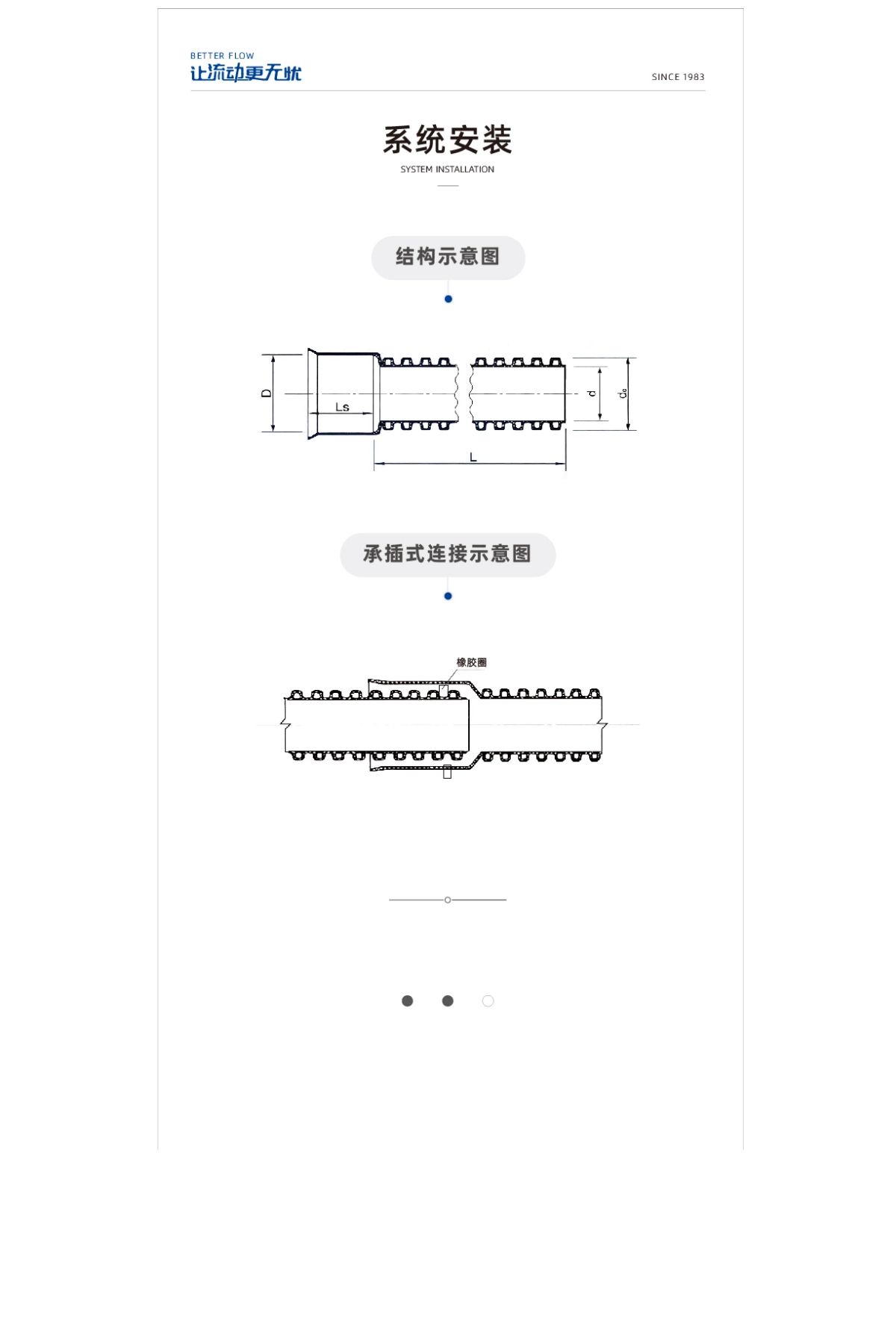 “公元” “永高”牌PVC-U双壁波纹管是由硬质聚氯乙烯为主要原料生产,内壁光滑、外壁波纹、内外壁之间中空的特殊管道。主要用于埋地排污、排水系统,产品尺寸110~630mm。产品执行标准GB/T 18477.1《埋地排水用聚氯乙烯(PVC-U)结构壁管道系统 第1部分:双壁波纹管材》结构特殊、接口利用橡胶密封圈柔性连接,具有连接牢靠、不易泄漏、搬运轻便、施工方便等特点,综合造价比铸铁管、水泥管低,使用寿命长达50年以上。双壁波纹管是世界各国塑料埋地排水、排污应用最多的管道。