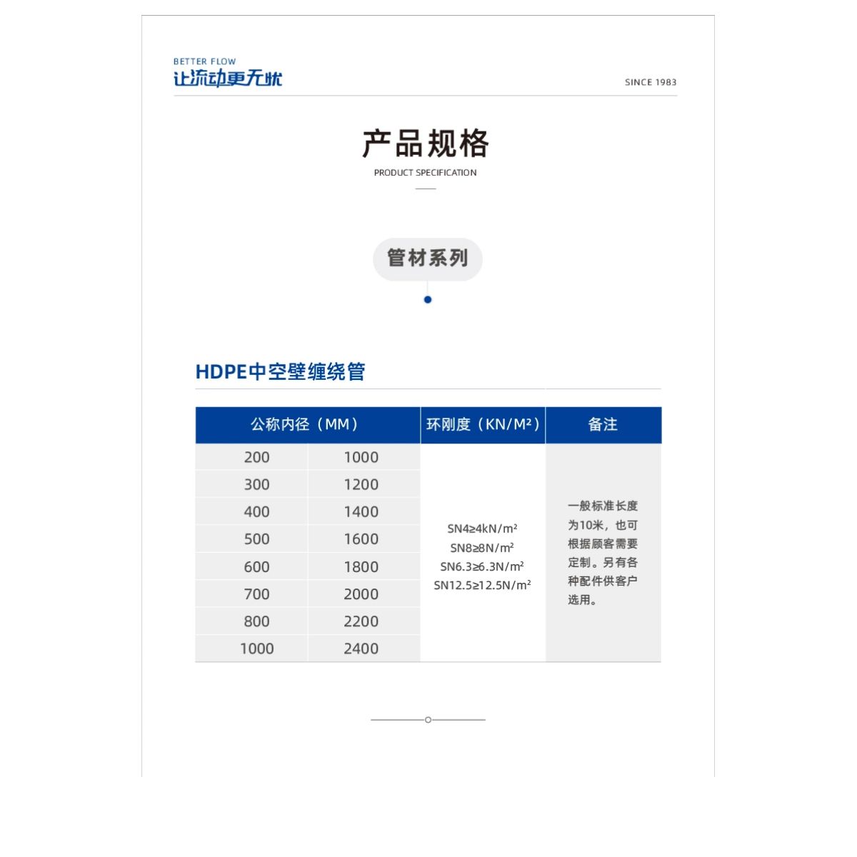 产品执行标准为GB/T 19472.2《埋地用聚乙烯(PE)结构壁管道系统 第2部分:聚乙烯缠绕结构壁管材》,具有优异的环刚度和良好的强度与韧性,重量轻、耐冲击性强,不易破损等特点,产品技术成熟,在国外已得到广泛应用,在国内已被建设部评为推广产品。