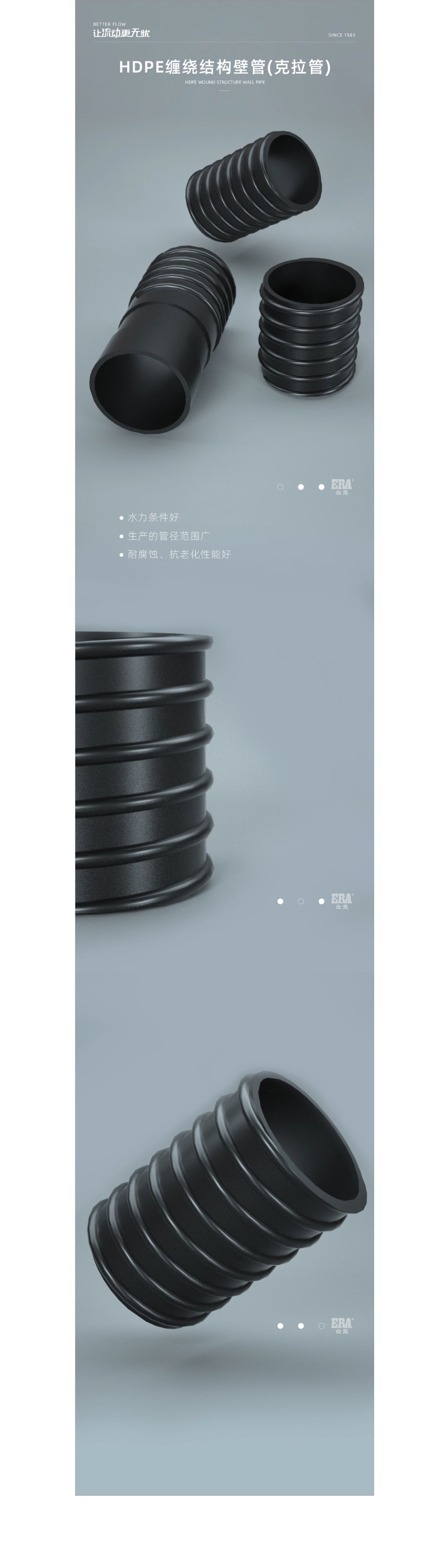 “永高”牌——聚乙烯(PE)缠绕结构壁B型立交思危管(俗称克拉管,以下简称克拉管),是一种内壁光滑、外壁为螺旋状加强肋,由底膜和肋界面为O型的肋管经螺旋缠绕工艺制成的异形结构壁柔性管材,采用高密度聚乙烯为原料,在热熔状态下通过缠绕工艺一次成型,并在热态未脱模前通过滚动风冷方式冷却,管道逐步散热,壁厚均匀,无内应力管道连接采用承插式电熔连接和节流式承插连接,施工便捷且安全零渗漏,在全世界范围内早已得到广泛应用,在中国被建设部评为重点推广产品,是国家推广城市雨污水系统“以塑代钢、以塑代水泥”的新型优质管材产品。经过不断研发创新,该产品抗震设防烈度达9级,适用于不均匀沉降地质区域及地震带区域。